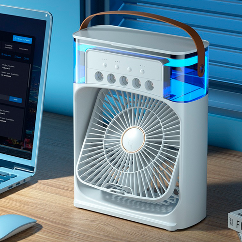 Com um tanque de 600ml para refrigeração de umidificação, o  Mini Ar Condicionado Portátil Turbo 3 em 1  umidificador de ar pode diminuir a temperatura ambiente. Possui 5 borrifadores de água  e conta com 3 modos de intensidade.